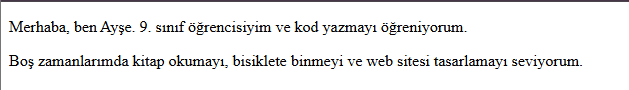 Bir metni cümleler hâlinde yazmak istediğinde paragraf etiketi kullanırsın. Her paragraf için ayrı bir <p> etiketi açılır ve kapatılır.