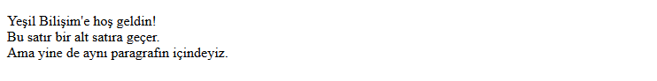 Bazen yeni bir paragraf açmadan, sadece satır atlamak istersin. Bunun için <br> etiketi kullanılabilir. Fakat gereksiz yere çok fazla <br> kullanmak sayfayı karmaşık hâle getirebilir.